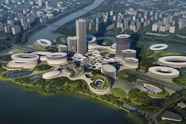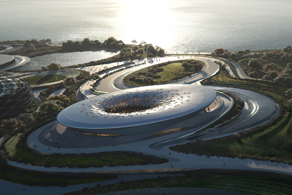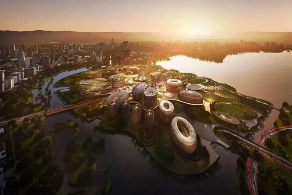 设计理念为「荷塘莲花」,基于全岛地貌构建高低错落、布局灵活的椭圆形中空建筑,呈现花瓣般的图景,围绕一个共享的中央核心交互聚集,象征着独角兽岛设立的初衷:有机聚合最好的人才和企业。