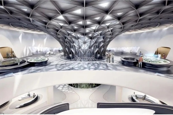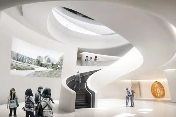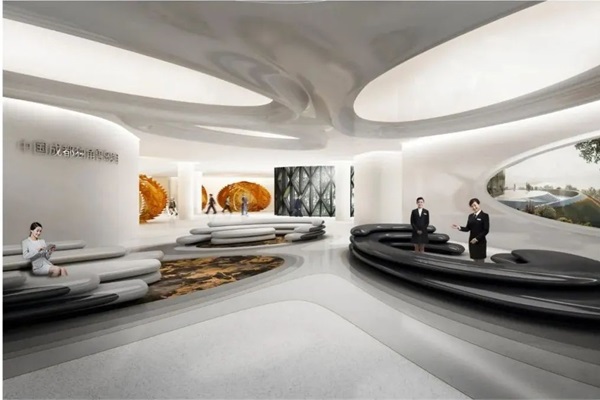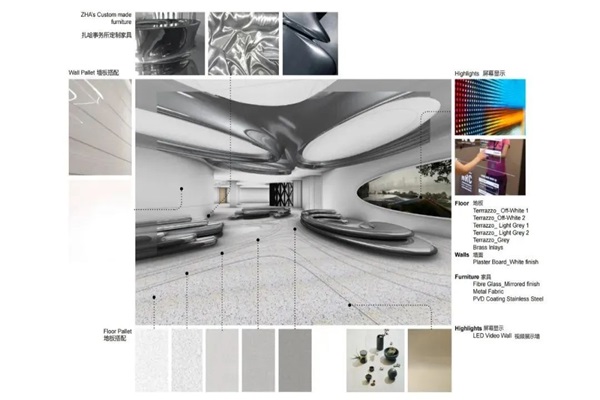 项目一期启动区的室内设计,整体材料搭配经过精心挑选, 阐述了总体规划的创新和未来主义精神。通过冷材料与温暖氛围的冲撞与融合,将大气与用户对舒适度、意识、 焦点或放松的要求联系起来,极大增强了空间对感官体验的影响。