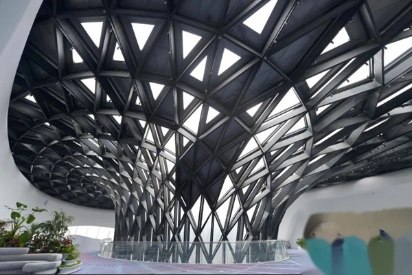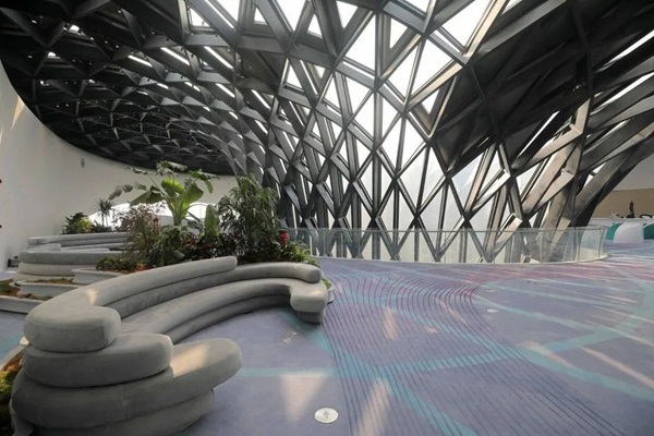 其设计手法符合扎哈一惯突破现实思维模式的理念,流动丝巾一样的长弧曲线,流露出贴近自然的浪漫品位,而这种自然随性的流动感、天马行空的表现力,只有通过磨石才能完美表达,这是其它地坪材料难以企及的,也正是环氧磨石的灵魂所在。因此,启动区地面的完成效果获得了项目负责人和设计师团队的一致好评。