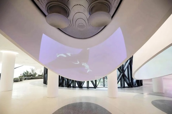整个建筑地面通过多种颜色的环氧磨石做整体弯曲拼接,简洁的线条在地面穿行,行云流水般流畅轻盈,既与整体建筑风格浑然一体,又大大提升了空间层次感,鲜明展现出充满未来感的建筑美学。