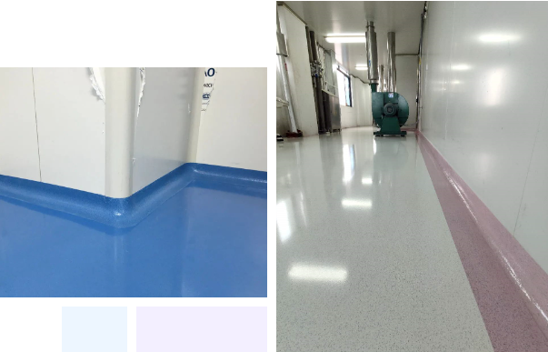 传统的地坪容易藏污纳垢,积水、发霉,且留有卫生死角,积尘不易清洁。而彩砂自流平地坪搭配圆弧角技术,能使墙体一体化,解决直角死角藏污纳垢的问题,易清洁、耐弱酸碱,减少霉菌滋生。