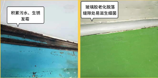 3、玻璃胶老化、整体连接有缝隙、不能完全密封