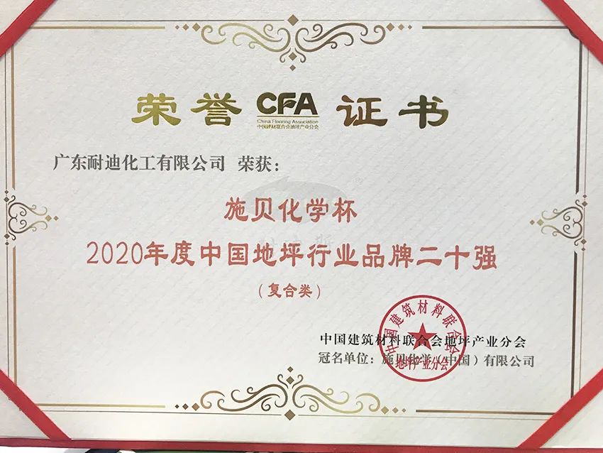 热烈祝贺中国建材联合会地坪产业分会(CFA)年会在嘉兴隆重召开!广东耐迪化工有限公司自营民族品牌“耐迪斯”连续七年收获《2020年中国地坪行业品牌二十强》荣誉!