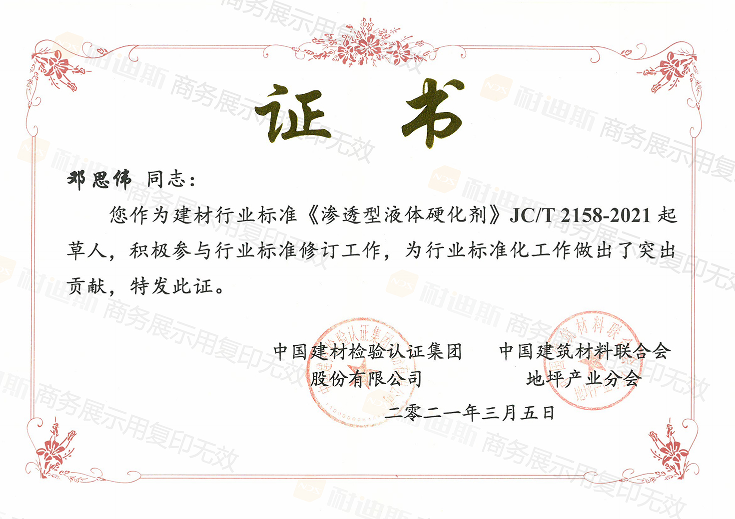 - 参编《渗透型密封硬化材料》等行业标准